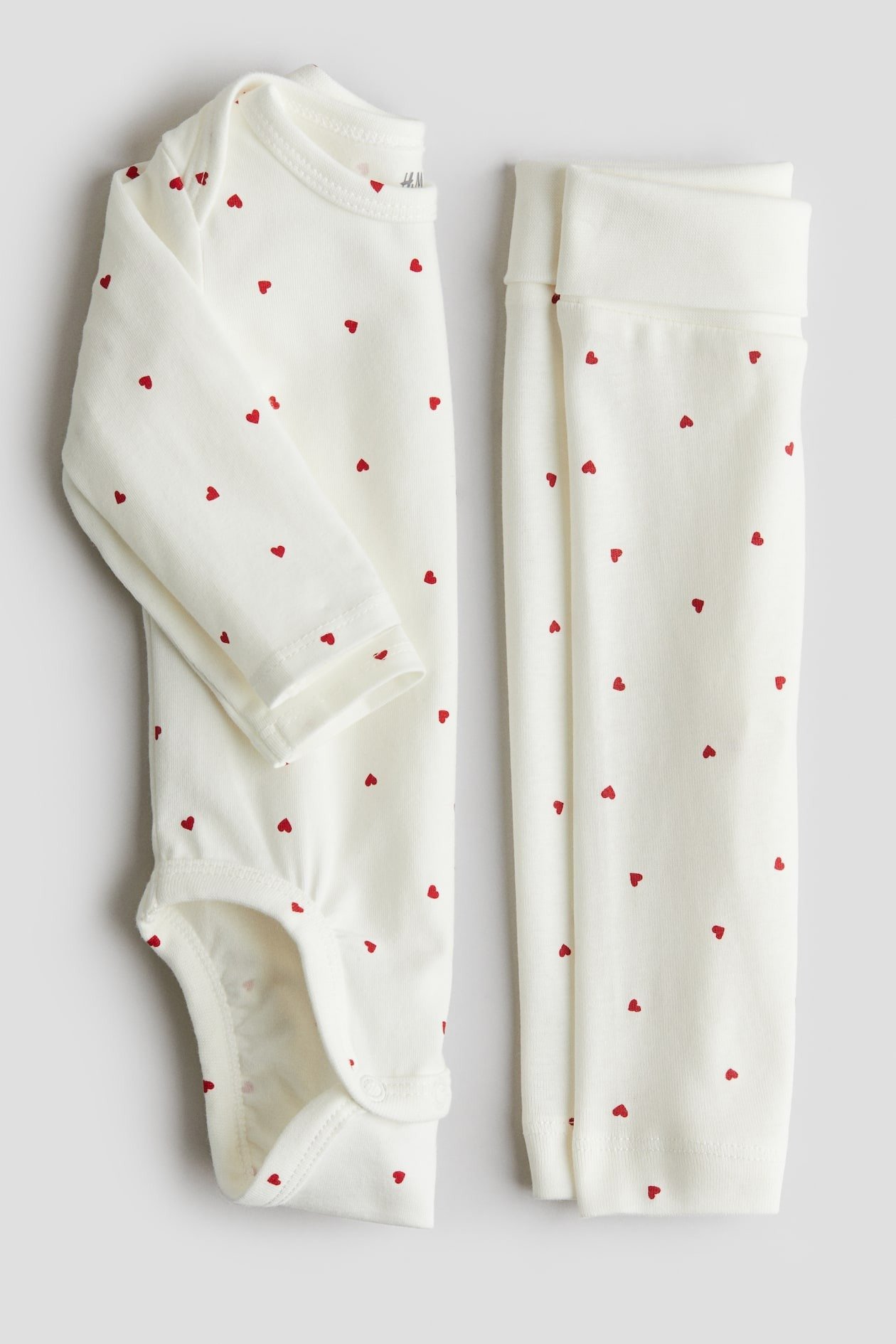 Set with a bodysuit and pair of leggings in supersoft cotton jersey. Long-sleeved bodysuit with lapped shoulders, press-studs at the crotch and gathered seams around the legs for a more comfortable and snug fit around the nappy. Leggings with a ribbed fold-over waist for a comfortable fit over the tummy.