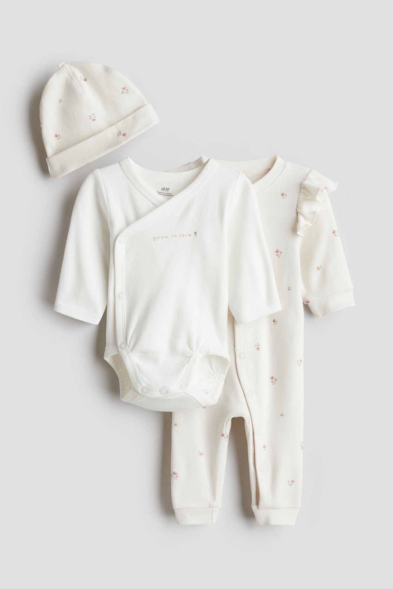 Gift set with a romper suit, wrapover bodysuit and beanie in supersoft cotton jersey. Long-sleeved romper suit with press-studs down the front that continue down one leg and trims at the cuffs and hems. Long-sleeved bodysuit with a printed motif on the front and press-studs at the sides and bottom for easy changing. Beanie with a turned-up hem.