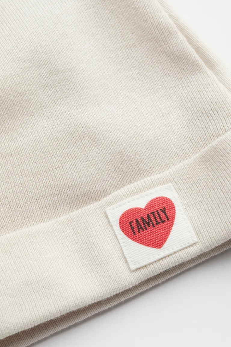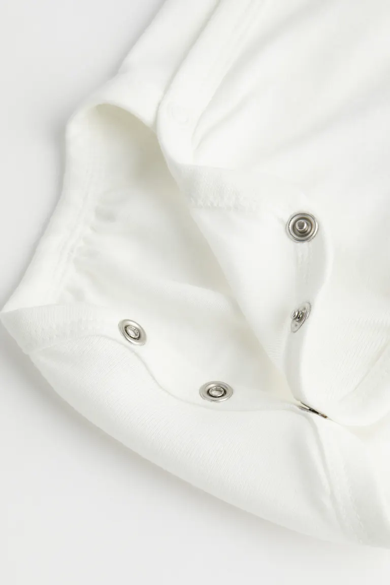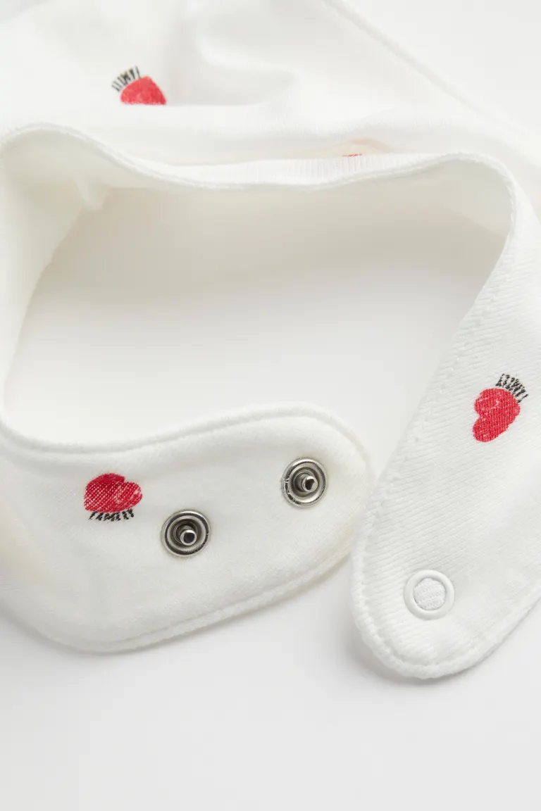 Gift set for newborns in soft cotton jersey comprising a short-sleeved romper suit, a short-sleeved bodysuit, a pair of leggings, a hat and a triangular scarf. Romper suit with a wrapover front and press-studs down the front and along one leg. Wrapover bodysuit with press-studs down the front and at the crotch. Leggings with a foldover elasticated waistband for an adjustable fit. Hat with a sewn-in turn-up. Triangular scarf with an adjustable press-stud fastening at the back of the neck.