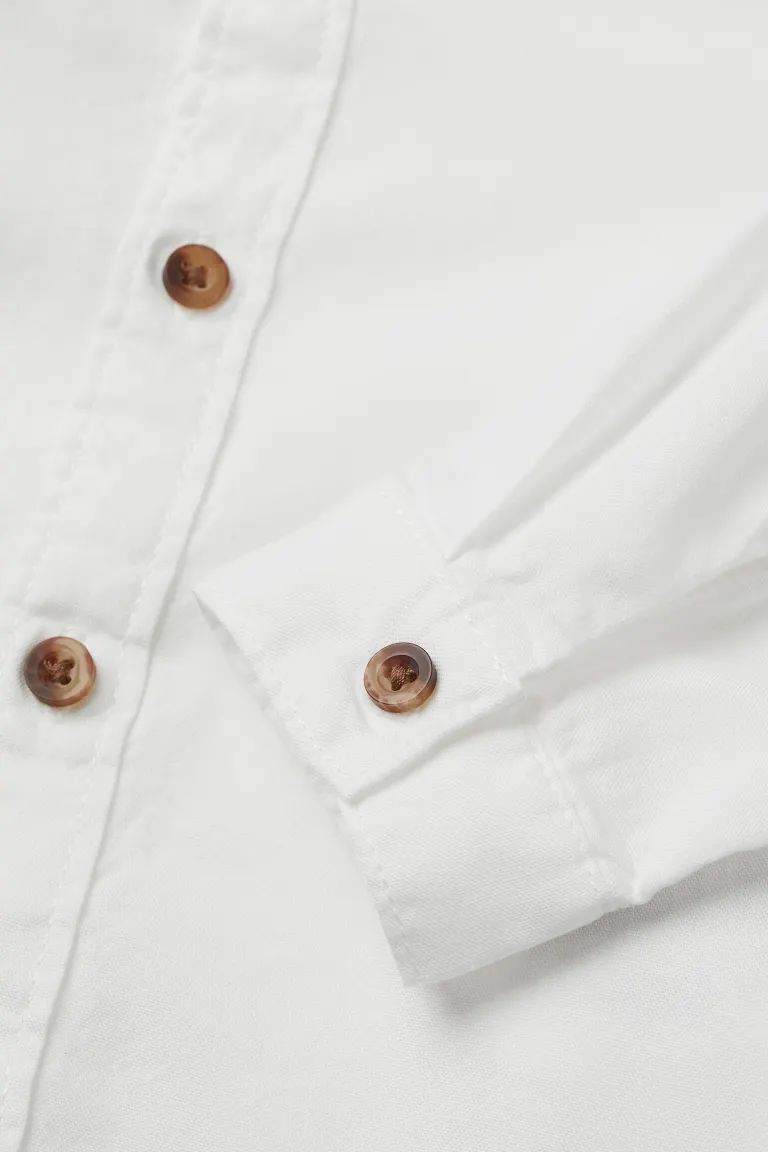 Set with a shirt and pair of lined trousers in a cotton weave with matching braces. Shirt with a button-down collar, buttons down the front, a yoke at the back, long sleeves with buttoned cuffs, and a rounded hem. Trousers with an adjustable, elasticated waist, fake fly with a button, patch front pockets and a fake back pocket. Soft jersey lining. Detachable elastic braces with imitation leather details.