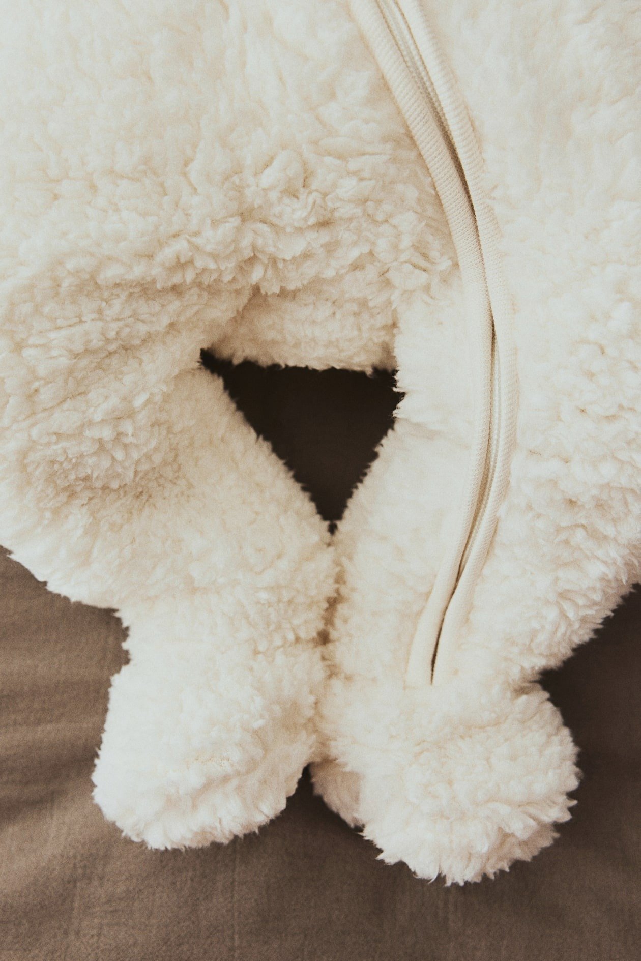 All-in-one suit in soft pile featuring a hood with ear-appliqués. Zip down the front with an anti-chafe chin guard. Foldover cuffs to keep the hands warm and full feet. Jersey lining.