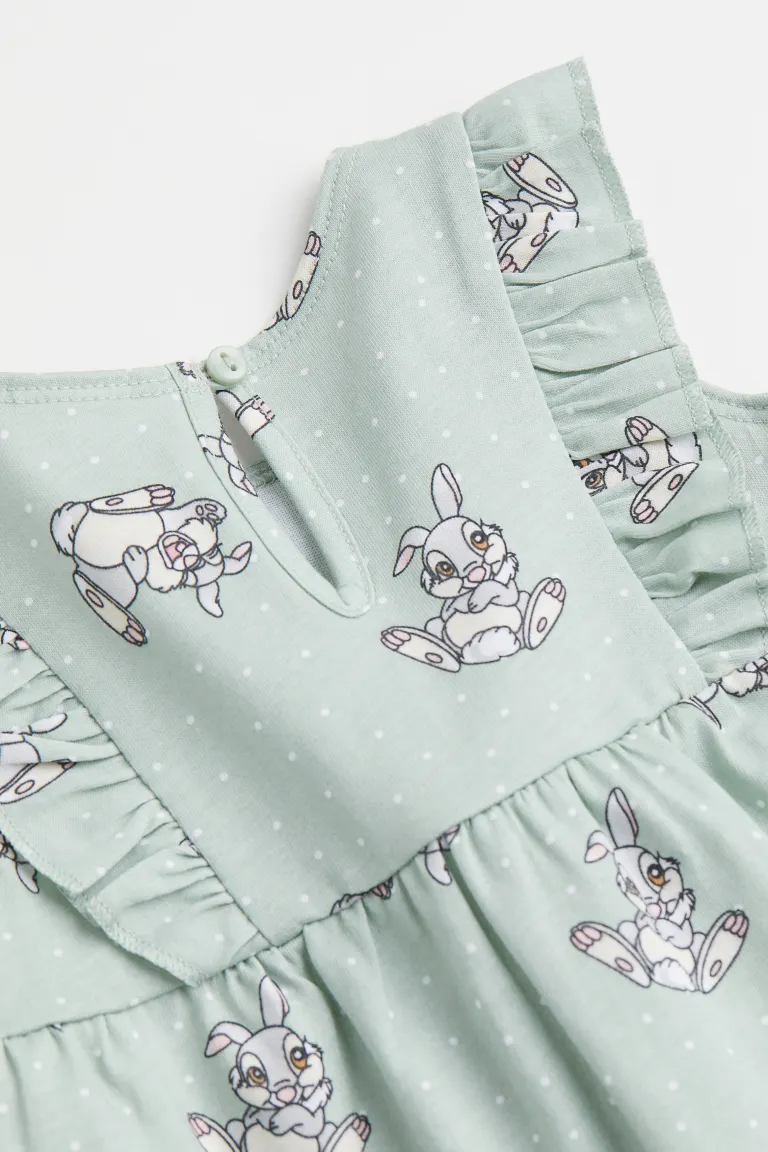 Sleeveless dress in soft, patterned cotton jersey with a small opening and button at the back of the neck and flounces down the front that continue over the shoulders and down the back. Gathered seam at the top and a flared skirt.