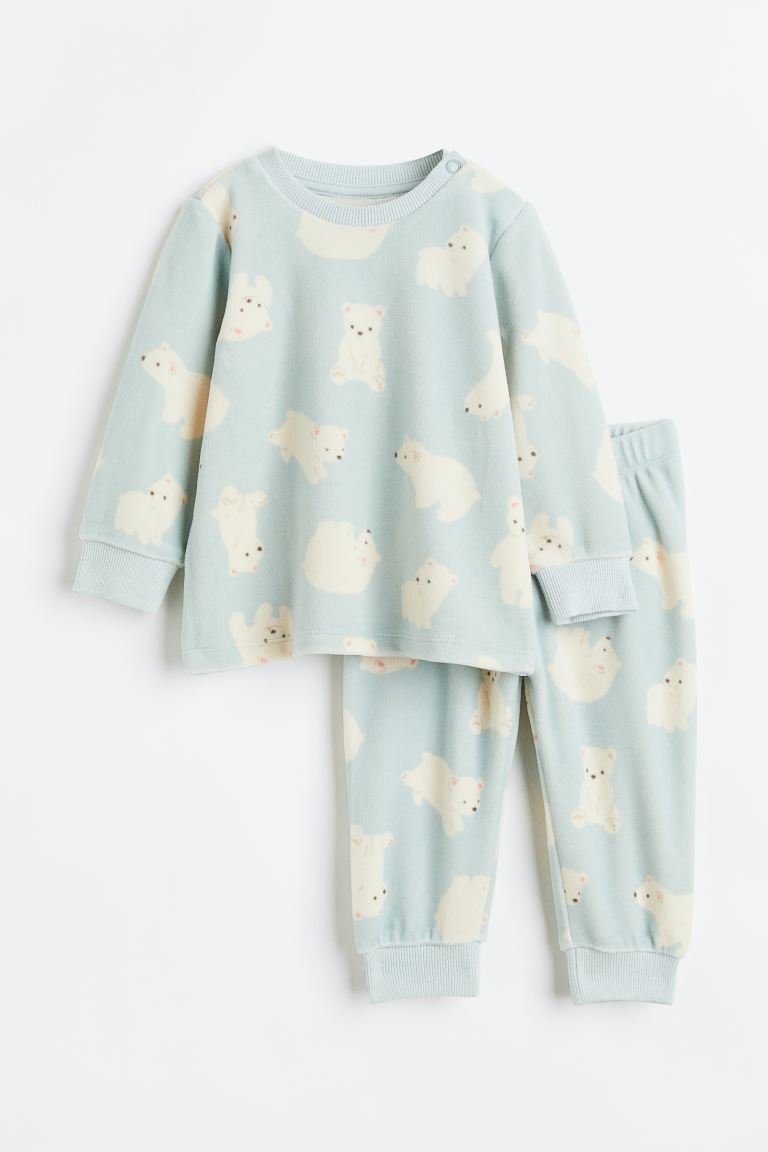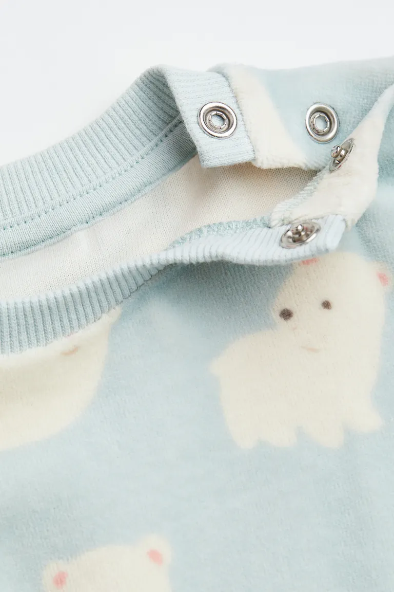 Pyjamas in soft velour with an all-over print. Top with press-studs on one shoulder, long sleeves and ribbing around the neckline and cuffs. Bottoms with an elasticated waist and ribbed hems.