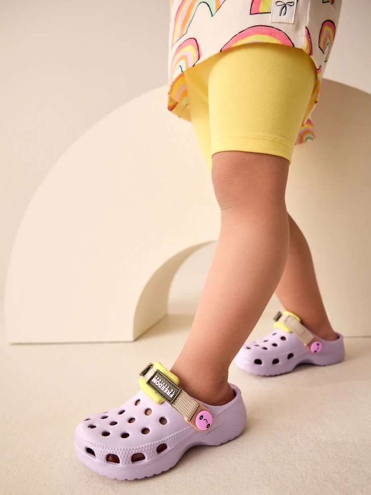 These lilac purple clogs have a modern techy look with an outdoorsy cushioned back strap, a breathable perforated upper and a slip-resistant durable sole.