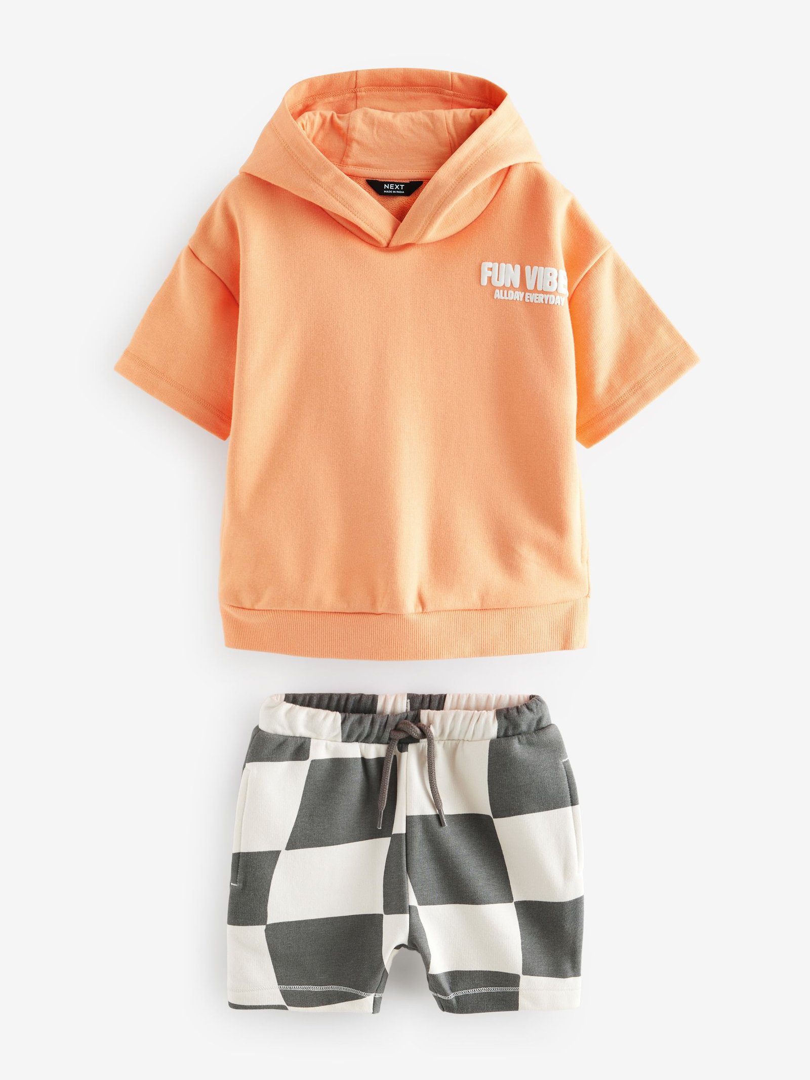 This stylish 2-piece set is perfect for everyday comfortable looks, featuring an orange short sleeve hooded sweatshirt and coordinating check shorts, made in a soft jersey construction.