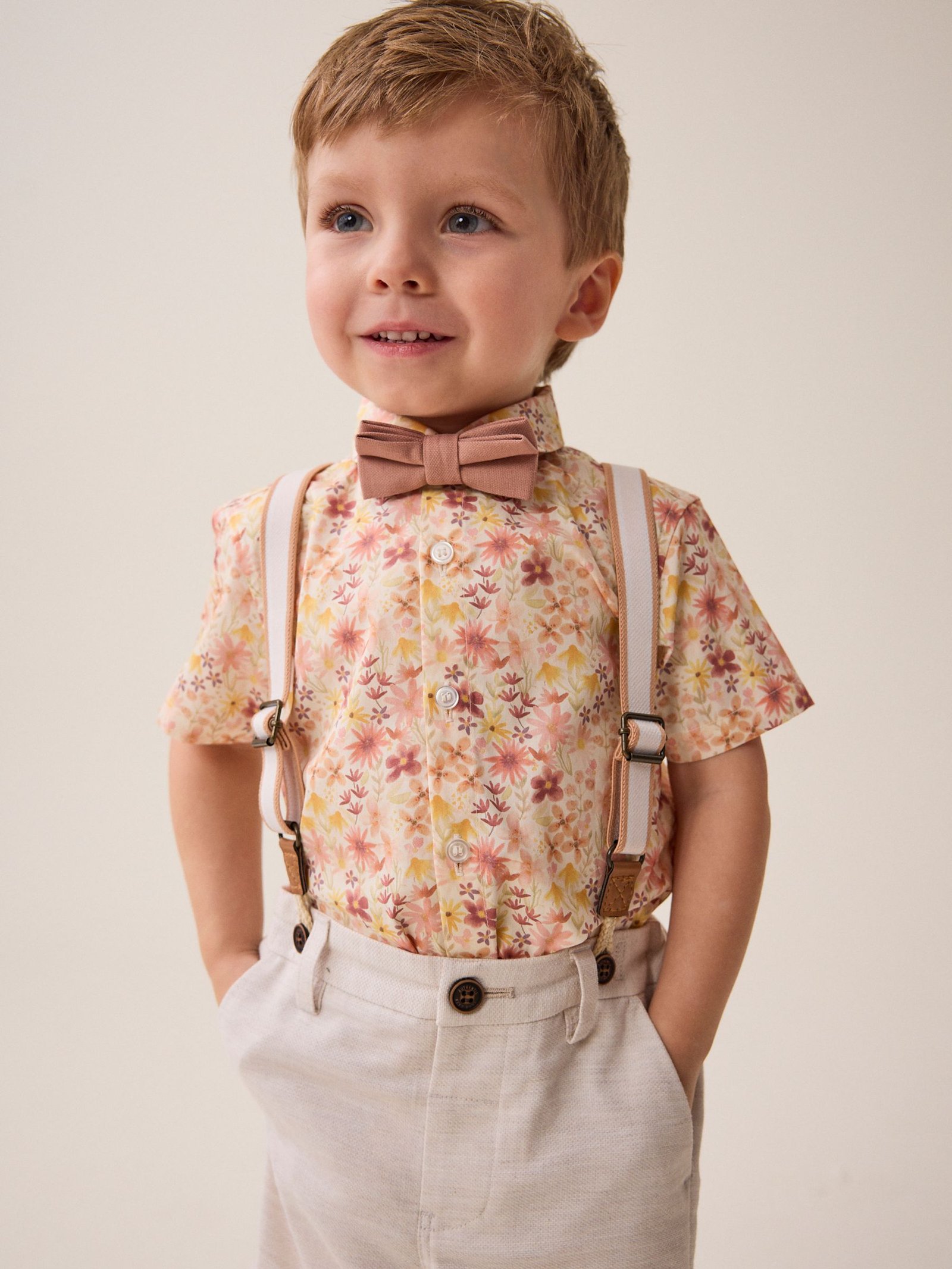 Next – Pink/Cream Floral Shirt Shorts 100% Cotton Braces and Bow Tie Set
