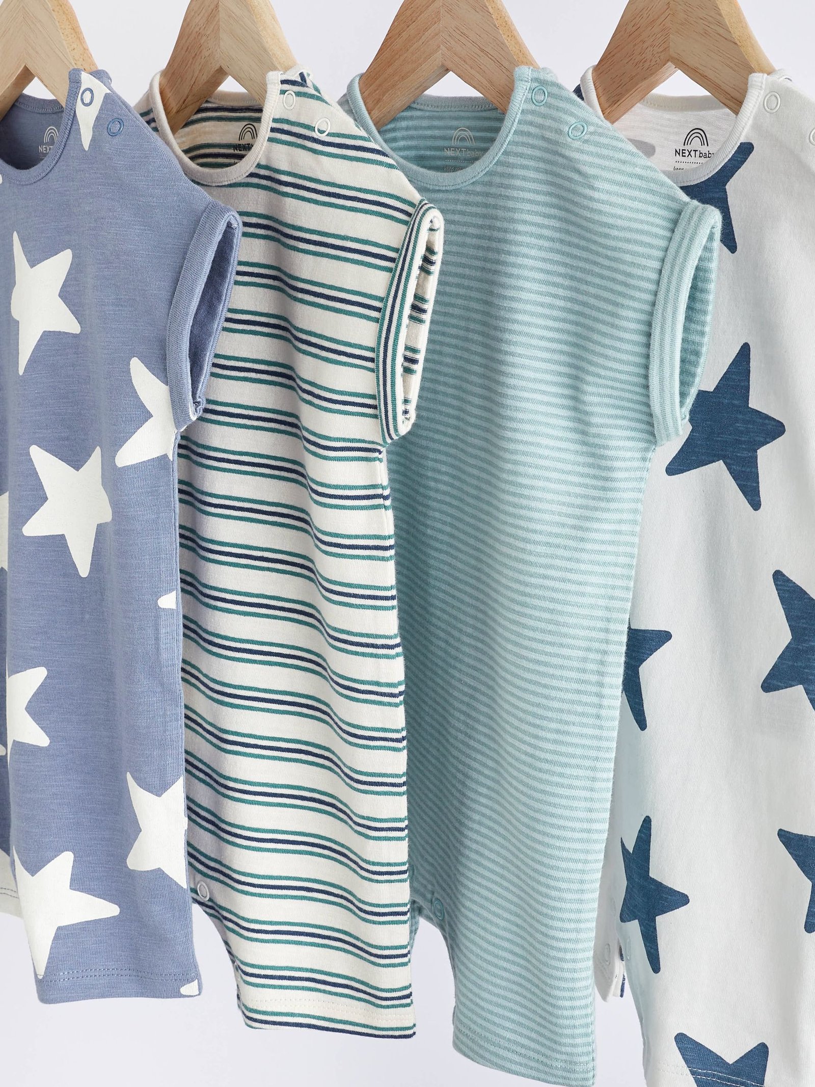 Stock up on baby essentials with this handy 4-pack of pure cotton teal blue star rompers, featuring a crewneck collar, short capped sleeves and a popper fastening for easy changing, finished with star and striped prints in shades of blue and teal.